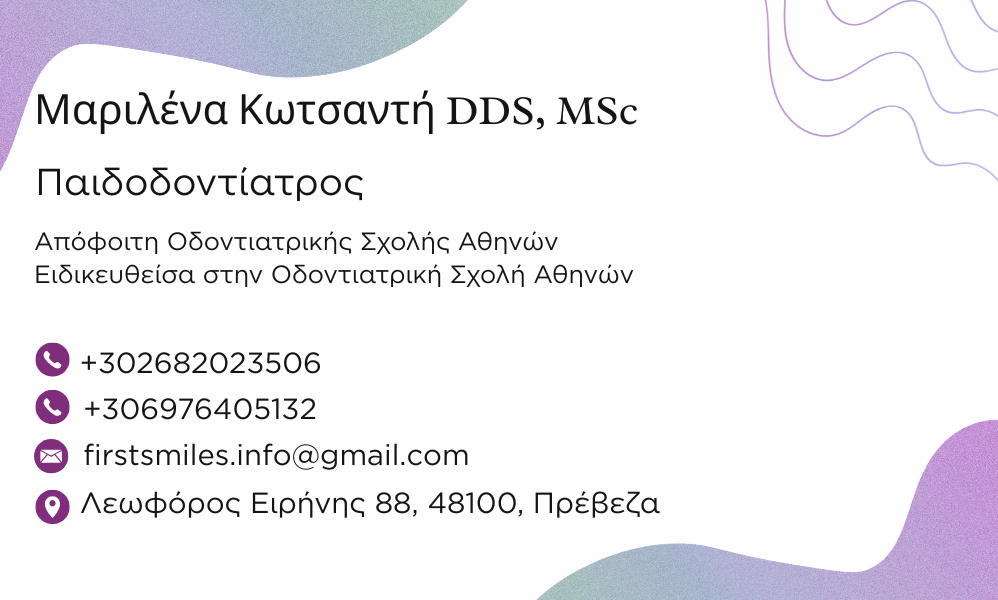 Η Παιδοδοντίατρος Κωτσαντή Μαριλένα DDS,MSc αναλαμβάνει οδοντιατρικά περιστατικά σε παιδιά και εφήβους έως 18 ετών στην Πρέβεζα, στην οδό Λεωφόρος Ειρήνης 88 (Οδοντιατρείο Βαρσάμη Δ.).