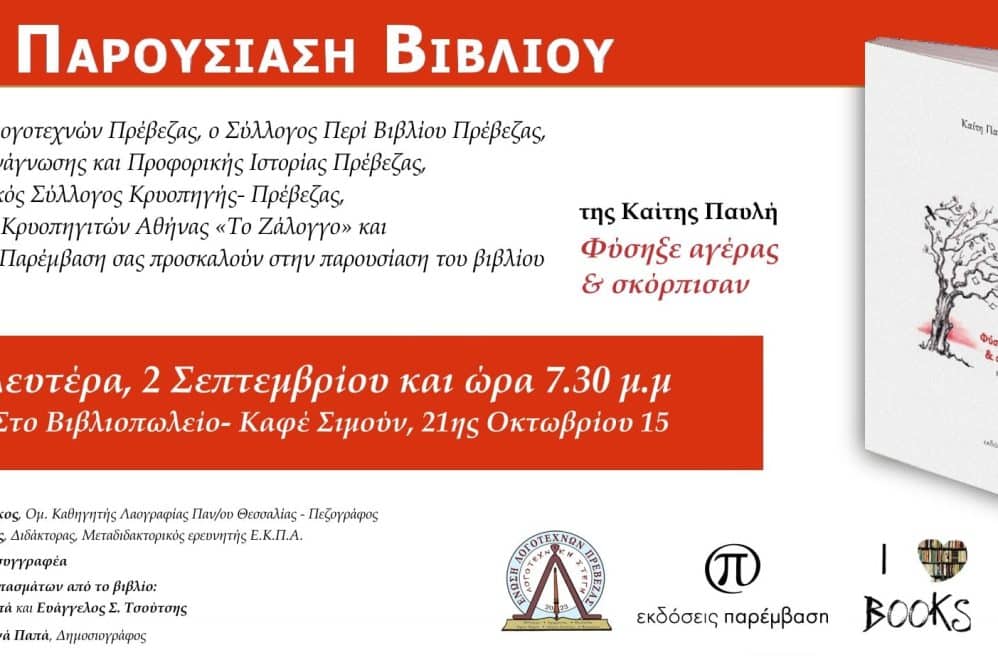 Η Ένωση Λογοτεχνών Πρέβεζας,  Ο Σύλλογος Περί Βιβλίου Πρέβεζας, Η Ομάδα Ανάγνωσης και Προφορικής Ιστορίας Πρέβεζας Ο Πολιτιστικός Σύλλογος Κρυοπηγής- Πρέβεζας ,  Ο Σύλλογος Κρυοπηγιτών Αθήνας «Το Ζάλογγο» και Οι εκδόσεις ΠΑΡΕΜΒΑΣΗ παρουσιάζουν το βιβλίο  της Καίτης Παυλή- Τζίμα « Φύσηξε αγέρας και σκόρπισαν- μικρές ιστορίες», εκδόσεις   Π α ρ έ μ β α σ η, 2024.