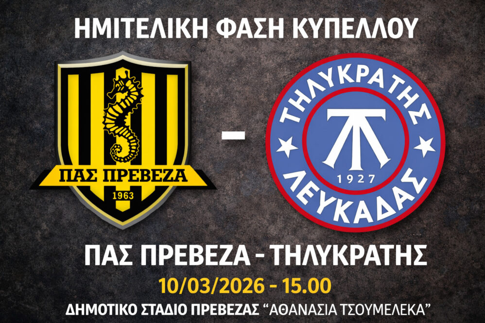 Ο ΠΑΣ Πρέβεζα υποδέχεται την Τρίτη 10 Μαρτίου 2026 και ώρα 15:00, στο Δημοτικό Στάδιο Πρέβεζας «Αθανασία Τσουμελέκα», τον Τηλυκράτη Λευκάδας για την ημιτελική φάση του Κυπέλλου της ΕΠΣ Πρέβεζας – Λευκάδας, σε μια αναμέτρηση που αναμένεται με ιδιαίτερο ενδιαφέρον από τους φίλους του ποδοσφαίρου της περιοχής.
