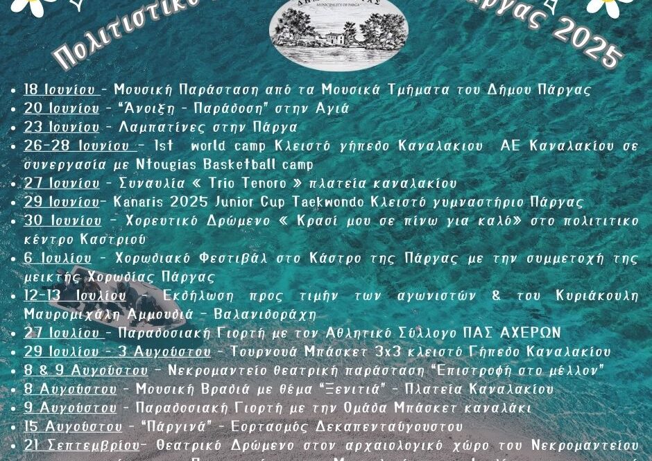Ο Δήμος Πάργας παρουσιάζει το πρόγραμμα των πολιτιστικών εκδηλώσεων για το καλοκαίρι 2025, γεμάτο μουσική, παραδόσεις, θέατρο και αθλητικές δράσεις για μικρούς και μεγάλους. Από τον Ιούνιο έως και τον Σεπτέμβριο, σας περιμένουμε να ζήσουμε όλοι μαζί μοναδικές εμπειρίες και αξέχαστες στιγμές!