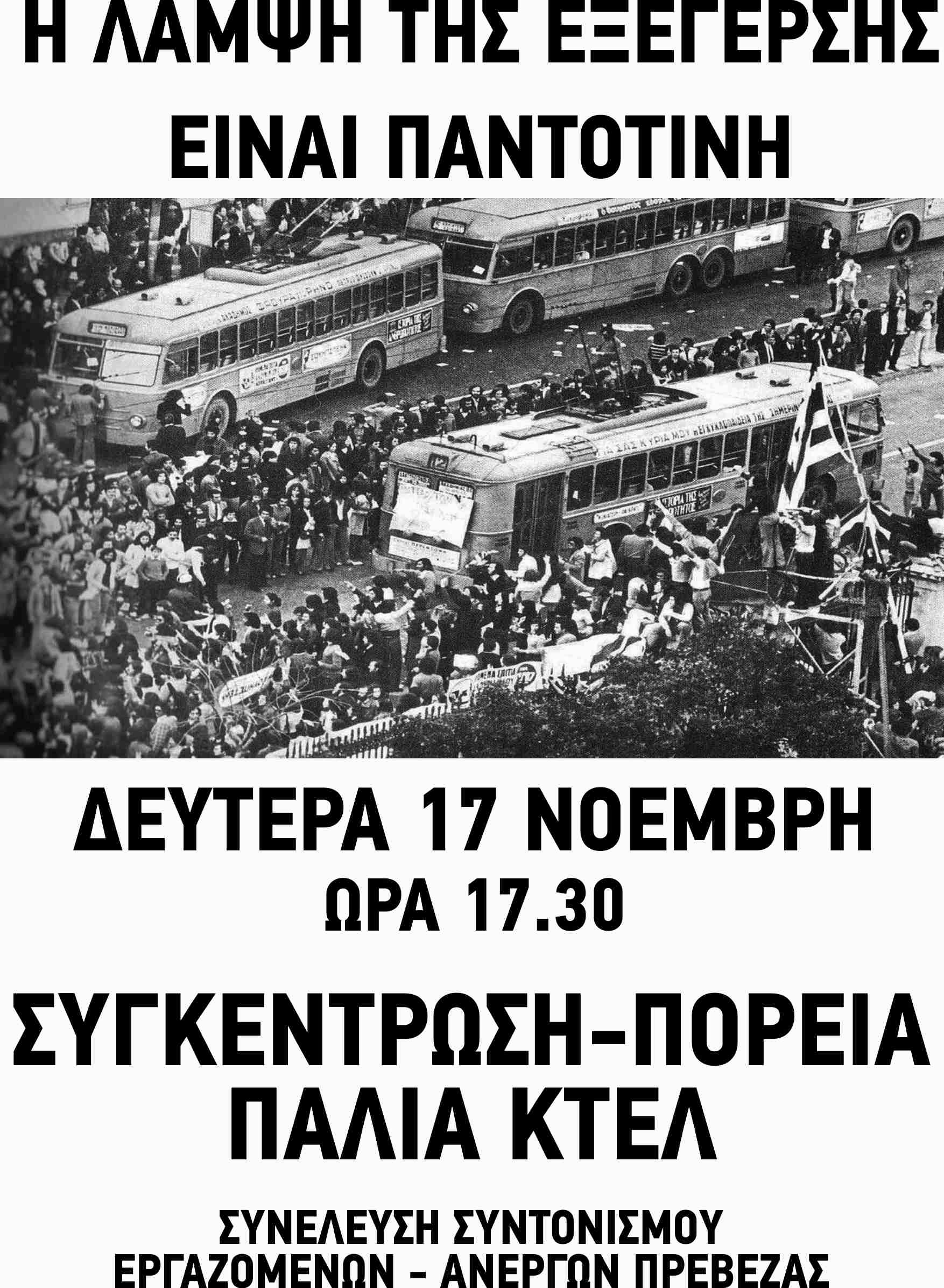 «52 Χρόνια από την Εξέγερση του Πολυτεχνείου – Το Εργατοϋπαλληλικό Κέντρο Ν. Πρέβεζας καλεί σε εκδήλωση μνήμης και τιμής στις 17 Νοέμβρη»