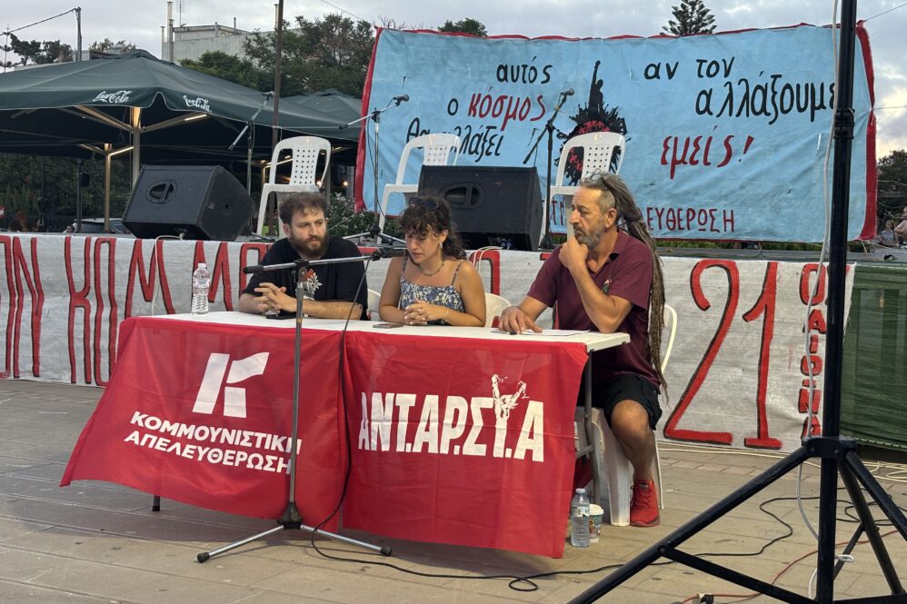 Ακολούθησε αντιπολεμική εκδήλωση με ομιλίες του Παντελή Βλάχα, μέλους της αποστολής March to Gaza, και του Σωτήρη Λιαμπότη, μέλους της Πολιτικής Επιτροπής της Κομμουνιστικής Απελευθέρωσης, που μετέφερε εμπειρίες από πρόσφατη παγκόσμια συνδιάσκεψη στη Νάπολη. Οι τοποθετήσεις κορυφώθηκαν με συνθήματα αλληλεγγύης προς τον παλαιστινιακό λαό και καταδίκης του ιμπεριαλισμού.