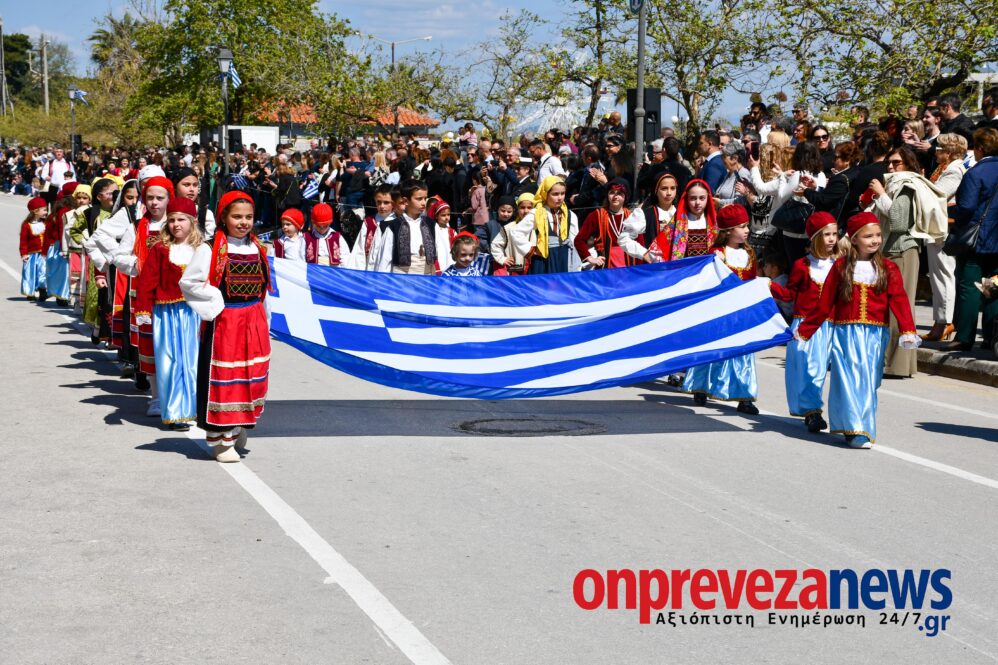 Η κορύφωση των εκδηλώσεων ήρθε λίγο αργότερα, στις 12 το μεσημέρι, στην οδό Σπηλιάδου. Η παρέλαση των μαθητών Πρωτοβάθμιας και Δευτεροβάθμιας Εκπαίδευσης, αντιπροσωπειών πολιτιστικών συλλόγων και άλλων φορέων, πραγματοποιήθηκε υπό τους ήχους των εμβατηρίων της Φιλαρμονικής Πρέβεζας «Ορφεύς», δημιουργώντας μια ατμόσφαιρα εθνικής ανάτασης.