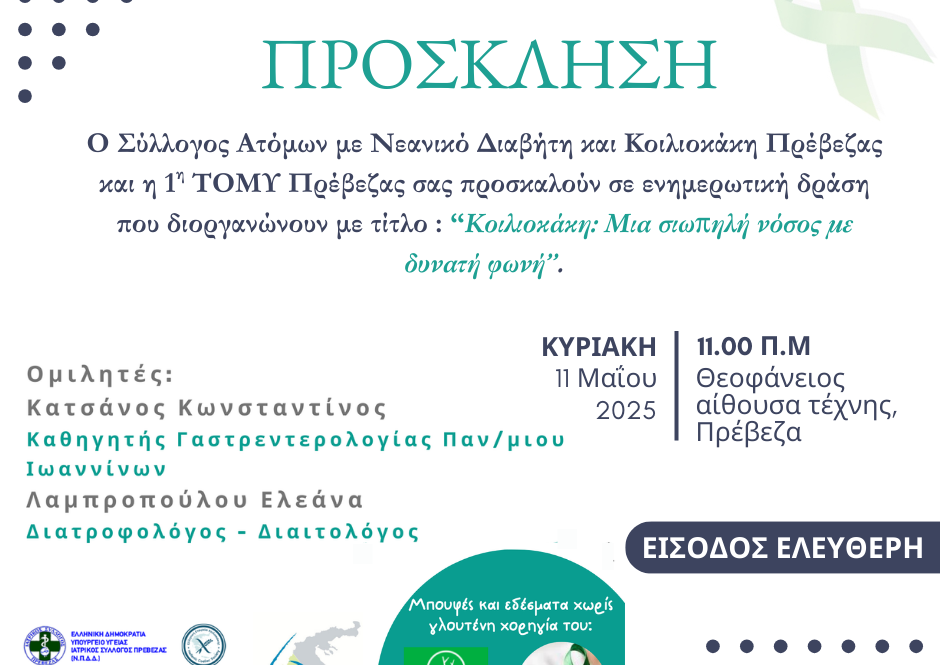ΥΓΕΙΑ Τρίτη 6 Μαΐου 2025 - 13:14 Πρόσκληση – Ενημερωτική δράση με τίτλο: ”Κοιλιοκάκη: Μια σιωπηλή νόσος με δυνατή φωνή” από ΟΜΑΔΑ ΣΥΝΤΑΞΗΣ 1η ΤΟΜΥ ΠρέβεζαςΣύλλογος Ατόμων με νεανικό διαβήτη και κοιλιοκάκη ΠρέβεζαςΥγεία