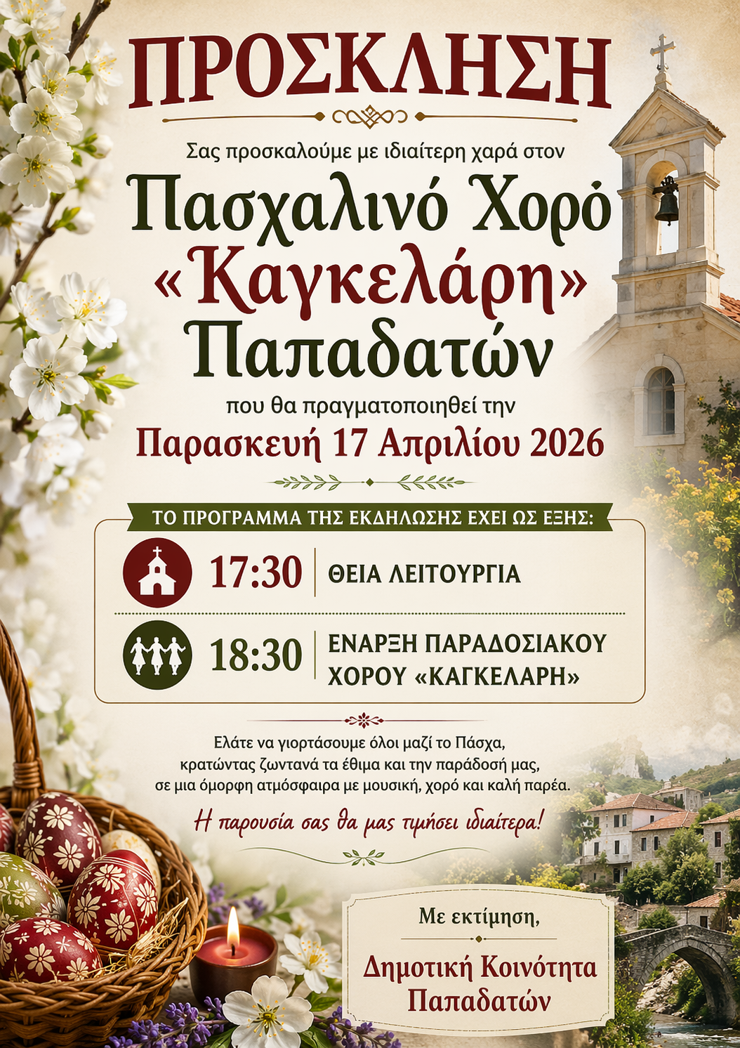 Η Δημοτική Κοινότητα Παπαδατών σας προσκαλεί με ιδιαίτερη χαρά στον παραδοσιακό Πασχαλινό Χορό «Καγκελάρη», μια εκδήλωση αφιερωμένη στη διατήρηση των εθίμων και της πολιτιστικής μας κληρονομιάς.