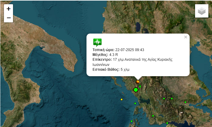 Σεισμική δόνηση μεγέθους 4,3 βαθμών της κλίμακας Ρίχτερ σημειώθηκε το πρωί της Τρίτης 22 Ιουλίου 2025, στις 09:43 τοπική ώρα, με επίκεντρο 17 χλμ ανατολικά της Αγίας Κυριακής Ιωαννίνων.
