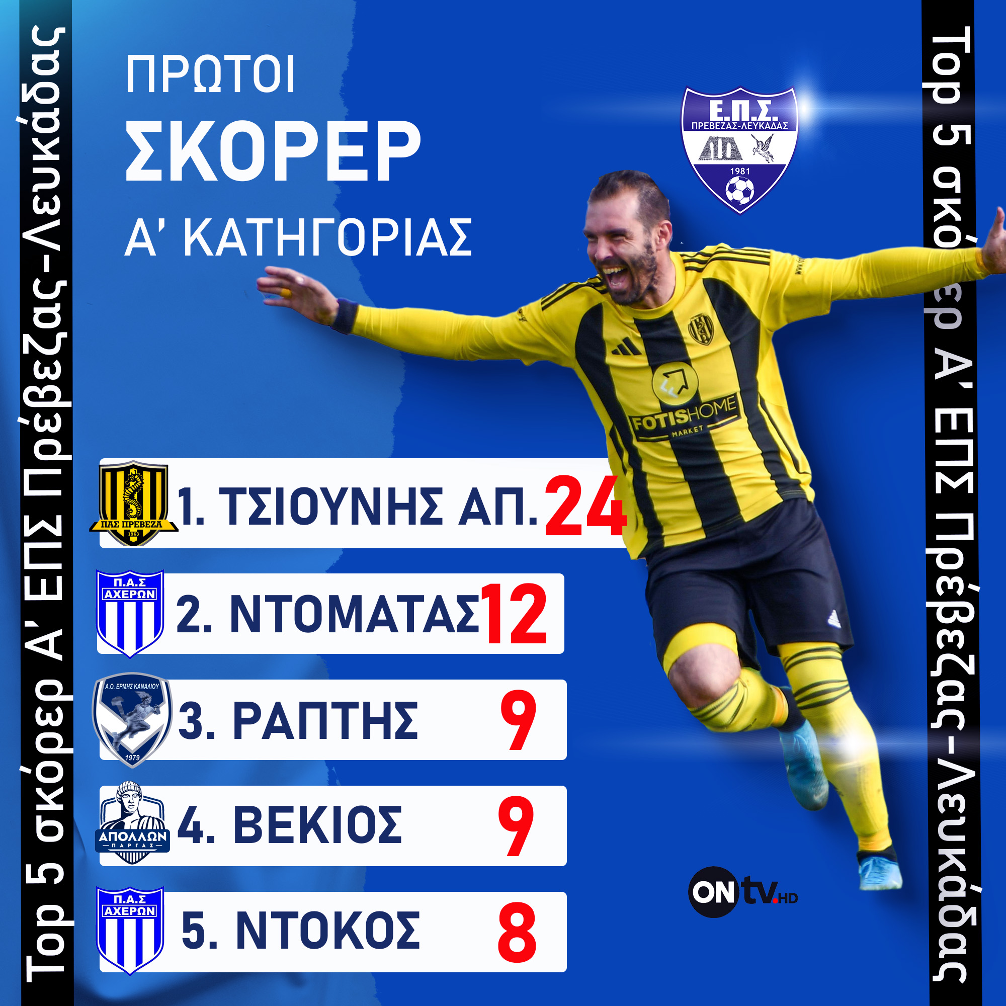 Ο πρώτος σκόρερ του ΠΑΣ Πρέβεζας, Απόστολος Τσιούνης, συνέχισε να «βομβαρδίζει» τις αντίπαλες άμυνες. Με ακόμη ένα χατ-τρικ έφτασε τα 24 γκολ σε 15 αγώνες, διατηρώντας εντυπωσιακό μέσο όρο 1,6 τέρματα ανά παιχνίδι. Οι αριθμοί του δεν αφήνουν περιθώρια αμφισβήτησης: πρόκειται για τον απόλυτο πρωταγωνιστή της φετινής σεζόν.