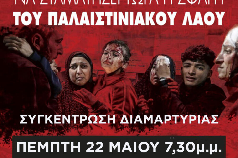 “ Είναι χαρακτηριστικό ότι στις 20 Μαΐου ο επικεφαλής για την ανθρωπιστική βοήθεια του ΟΗΕ ενημέρωσε ότι στη Γάζα κινδυνεύουν με θάνατο 14.000 μωρά, λόγω υποσιτισμού και έλλειψης φαρμάκων “ αναφέρει μεταξύ άλλων η ανακοίνωση-κάλεσμα εκφράζοντας την αλληλεγγύη των διοργανωτών της συγκέντρωσης στον Παλαιστινιακό Λαό.