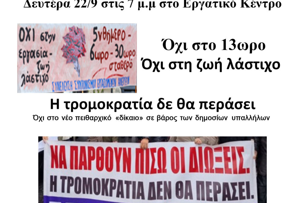 Συγκέντρωση ενημέρωσης και οργάνωσης του αγώνα και της απεργίας (1/10) ενάντια στα αντεργατικά νομοσχέδια της κυβέρνησης στον ιδιωτικό και δημόσιο τομέα