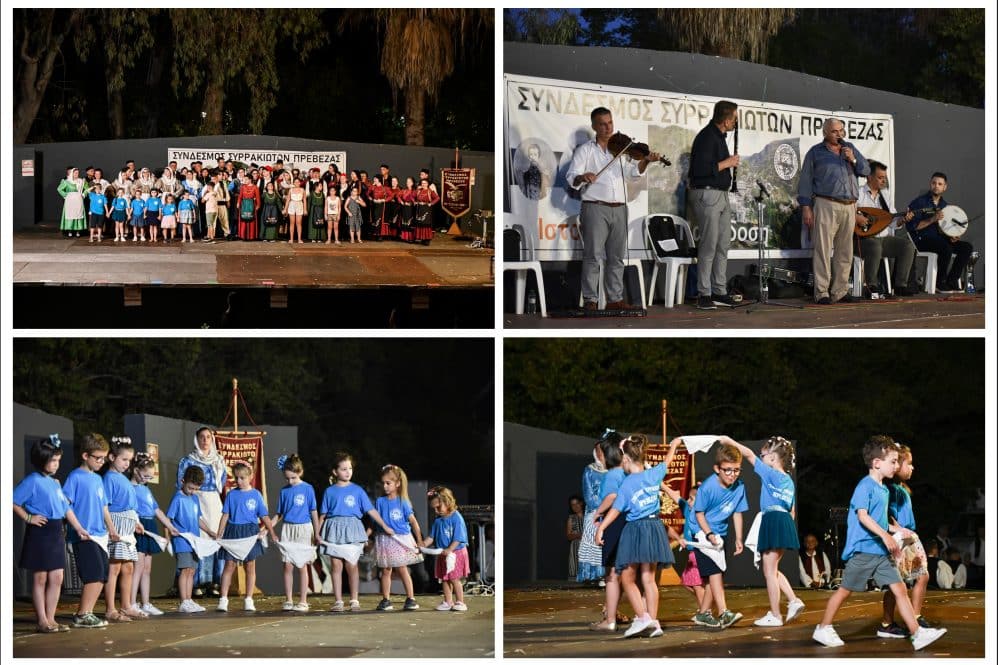Με ιδιαίτερη επιτυχία πραγματοποιήθηκε χθες (9/7/2024) το βράδυ η ετήσια μουσικοχορευτική εκδήλωση των χορευτικών τμημάτων του Συνδέσμου Συρρακιωτών Πρέβεζας, όπου μικροί και μεγάλοι χορευτές, παρουσίασαν παραδοσιακούς χορούς του Συρράκου, αλλά και από άλλα μέρη της χώρας μας.