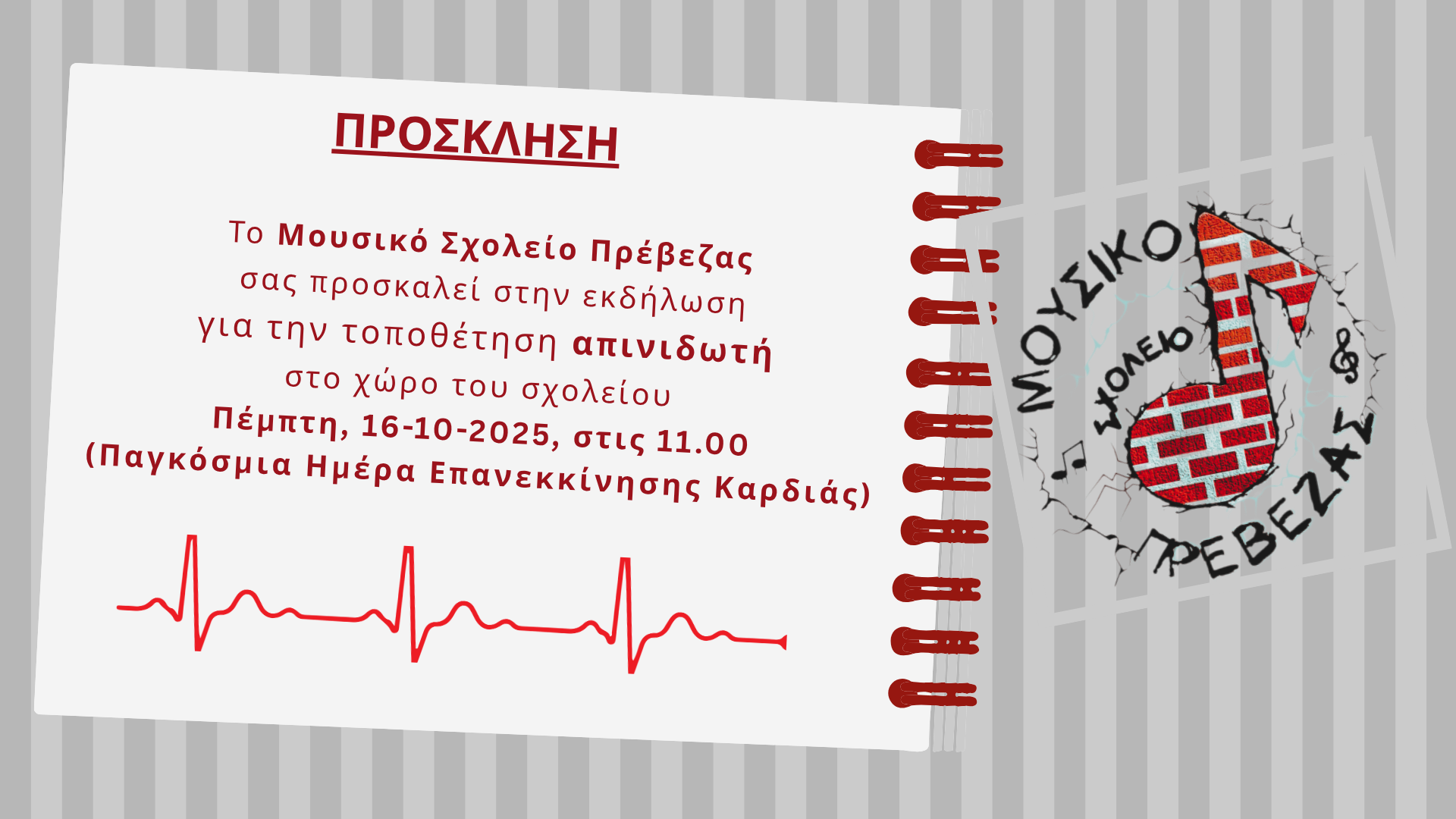 Με αφορμή την Παγκόσμια Ημέρα Επανεκκίνησης Καρδιάς, το Μουσικό Σχολείο Πρέβεζας προχωρά σε μια εξαιρετικά σημαντική και ουσιαστική πρωτοβουλία για την ασφάλεια της σχολικής κοινότητας και της τοπικής κοινωνίας. Την Πέμπτη, 16 Οκτωβρίου 2025, στις 11:00, θα πραγματοποιηθεί στον χώρο του σχολείου εκδήλωση για την τοποθέτηση αυτόματου εξωτερικού απινιδωτή (AED), ενός σωτήριου ιατρικού εργαλείου που μπορεί να αποδειχθεί καθοριστικό σε περιπτώσεις καρδιακής ανακοπής.
