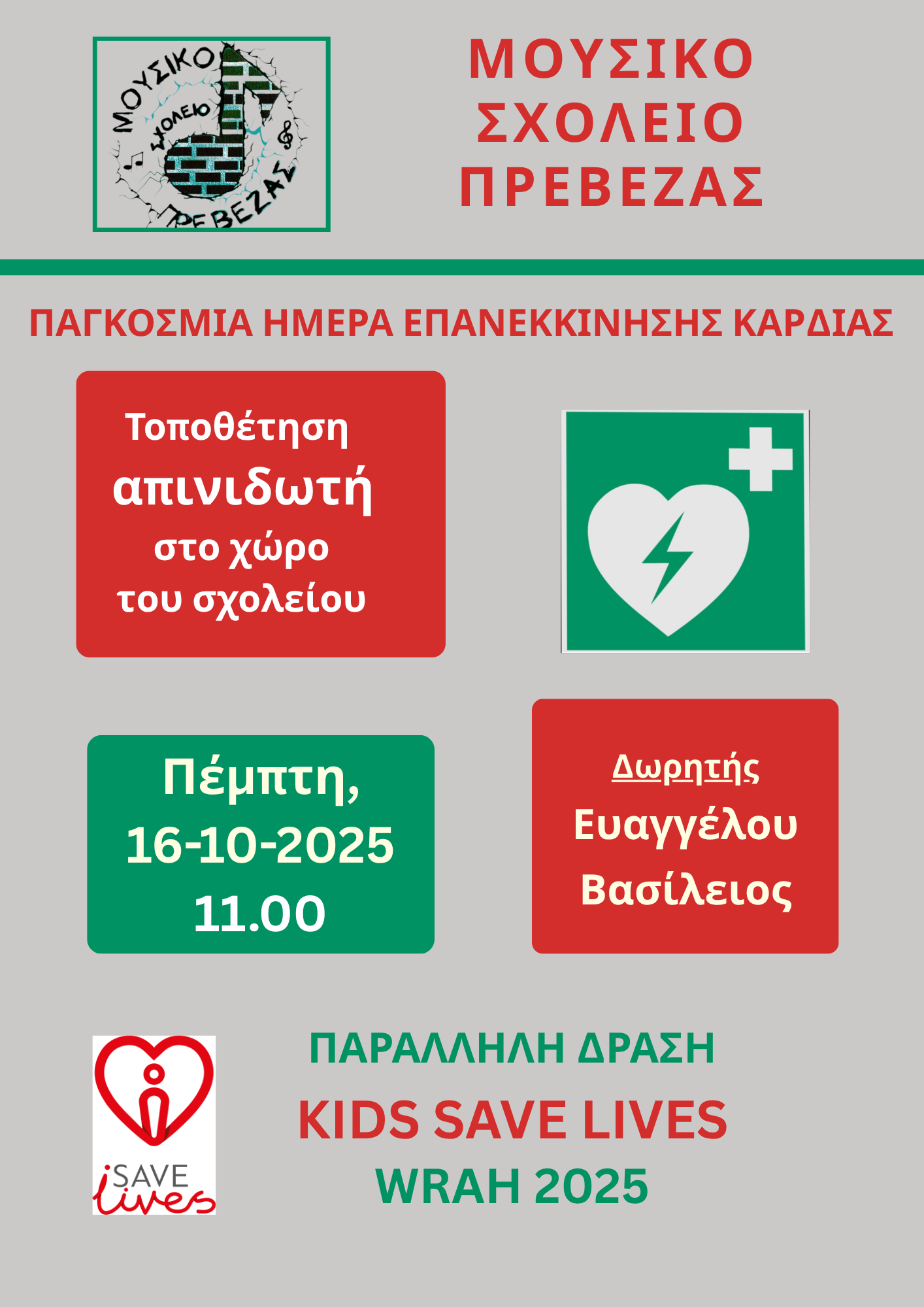 Το Μουσικό Σχολείο Πρέβεζας με «παλμό» ζωής – Τοποθέτηση απινιδωτή και δράση “Kids Save Lives” στο πλαίσιο της Παγκόσμιας Ημέρας Επανεκκίνησης Καρδιάς