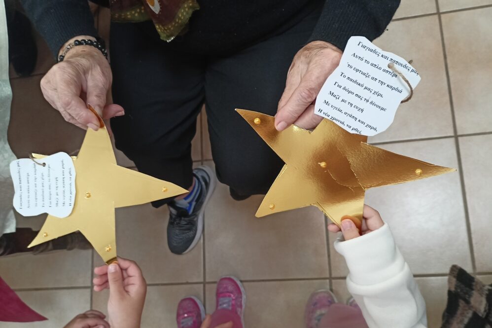 Οι μικροί μαθητές πρόσφεραν στους ωφελούμενους της δομής χρυσά αστεράκια με ευχές που τα κατασκεύασαν μαζί με τις δασκάλες τους.