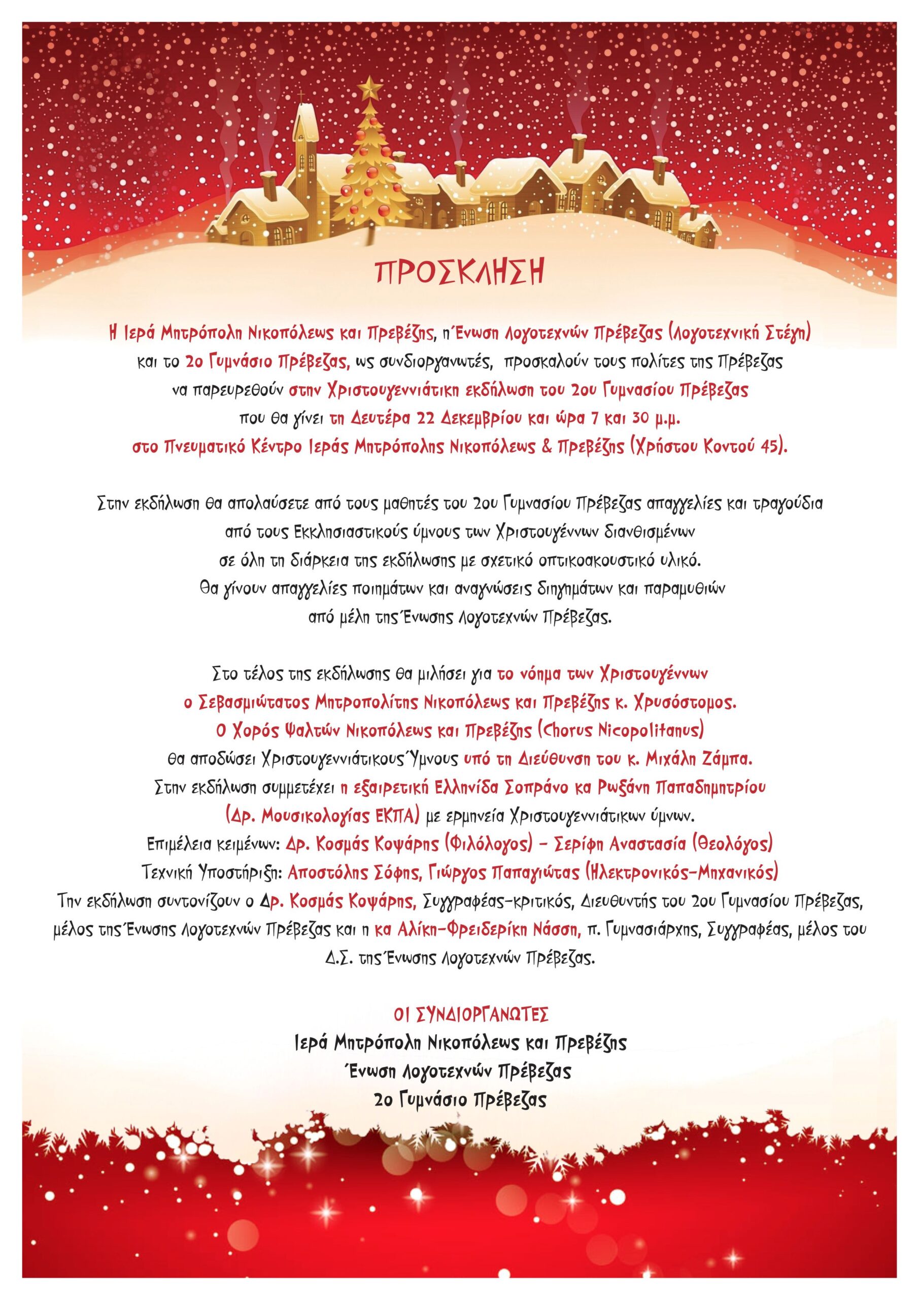 Η Ιερά Μητρόπολη Νικοπόλεως και Πρεβέζης, η Ένωση Λογοτεχνών Πρέβεζας (Λογοτεχνική Στέγη) και το 2ο Γυμνάσιο Πρέβεζας, ως συνδιοργανωτές,  προσκαλούν τους πολίτες της Πρέβεζας να παρευρεθούν στην Χριστουγεννιάτικη εκδήλωση του 2ου Γυμνασίου Πρέβεζας που θα γίνει τη Δευτέρα 22 Δεκεμβρίου και ώρα 7 και 30 μ.μ. στο Πνευματικό Κέντρο Ιεράς Μητρόπολης Νικοπόλεως & Πρεβέζης (Χρήστου Κοντού 45).