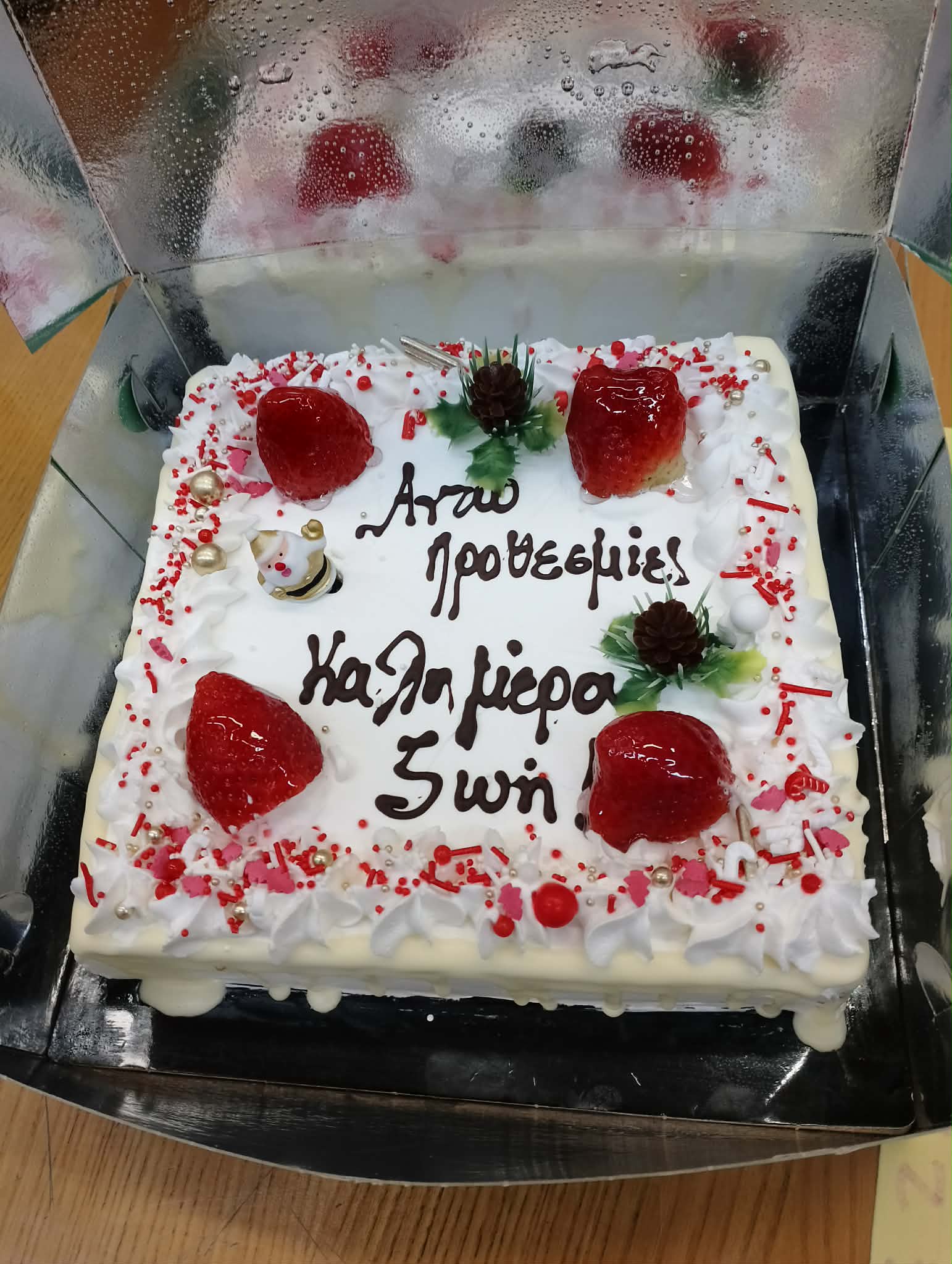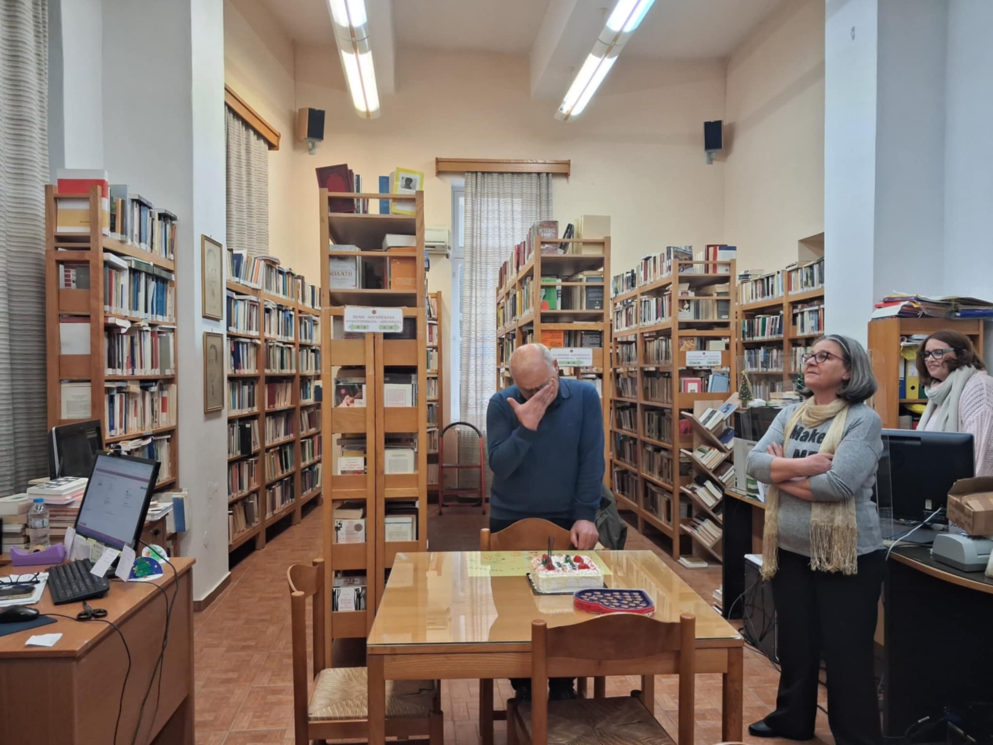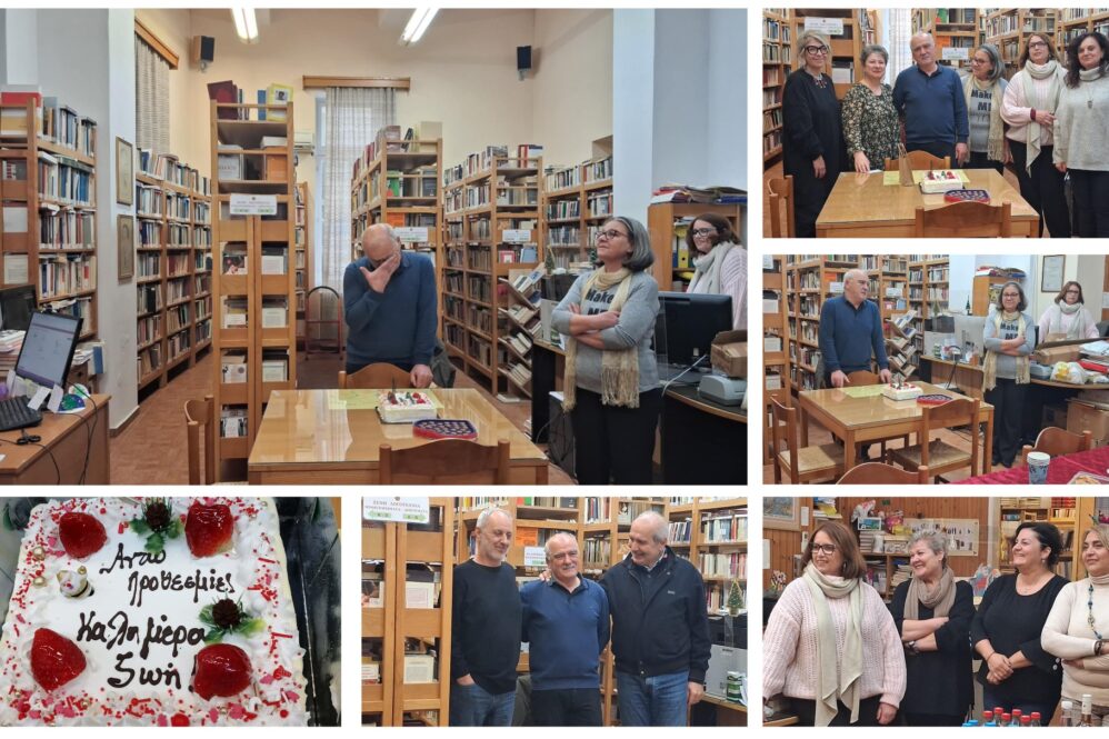 Οι συνάδελφοί του από τον Δήμο, τη Δημοτική Βιβλιοθήκη, την Παιδική Βιβλιοθήκη και το Τμήμα Πολιτισμού θέλησαν να του πουν το δικό τους «ευχαριστώ» με έναν τρόπο ζεστό και ανθρώπινο. Του ετοίμασαν μια αποχαιρετιστήρια έκπληξη, μια στιγμή γεμάτη αγάπη, με μια τούρτα που έγραφε: