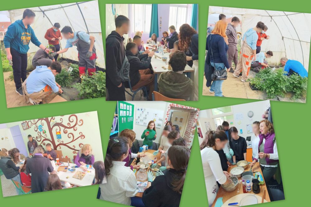 Έτσι συναποφασίσαμε να αγοράσουμε κάποια υλικά και να τους επισκεφτούμε ώστε να κάνουμε μαζί τους διάφορες δραστηριότητες, να τους γνωρίσουμε, να μάθουμε από αυτούς, να γίνουμε φίλοι και να κάνουμε πράξη όλα όσα είπαμε παραπάνω. Πράγματι σήμερα Τετάρτη 12 Μαρτίου πραγματοποιήθηκε η επίσκεψη στο ΕΕΕΕΚ από καθηγητές και 20 μαθητές της Β τάξης. Οι μαθητές του ΕΕΕΕΚ μάς υποδέχτηκαν με δισταγμό αρχικά αλλά σύντομα έγιναν πιο εκδηλωτικοί και κυρίως όταν αρχίσαμε τις δραστηριότητες μαζί τους. Μας έδειξαν πώς φυτεύουν τα φυτά, πώς τα μεταφυτεύουν στο θερμοκήπιό τους, πώς κατασκευάζουν αντικείμενα από πηλό (μπρελόκ, διακοσμητικά μαγνητάκια κ.ά). Όλοι οι μαθητές μαγείρεψαν μαζί τυρόπιτα, έπαιξαν ποδόσφαιρο, αντάλλαξαν κεράσματα που είχαν ετοιμάσει.
