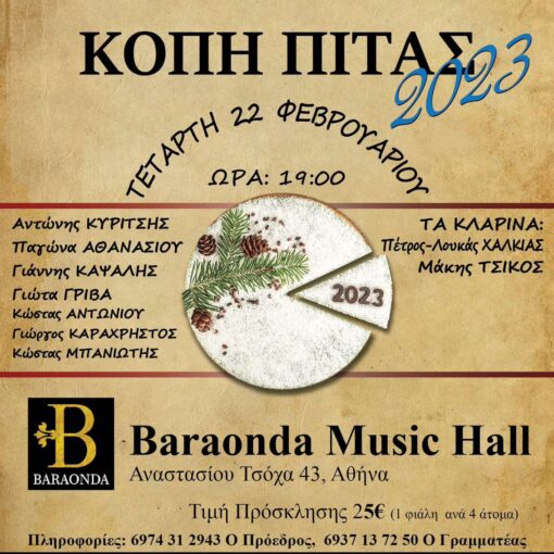 ΣΩΜΑΤΑ ΑΣΦΑΛΕΙΑΣ Τετάρτη 15 Φεβρουαρίου 2023 - 9:00 Πρωτοχρονιάτικη Πίτα 2023 “Ηπειρωτών Αστυνομικών” από ΟΜΑΔΑ ΣΥΝΤΑΞΗΣΣε ένα γλέντι για την νέα χρονιά από αυτά που […]