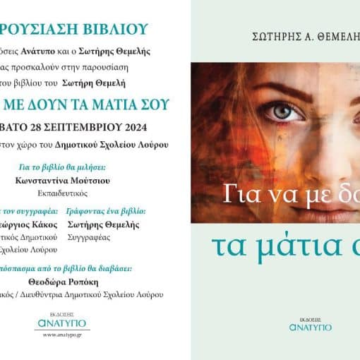 Πολιτισμός Δευτέρα 23 Σεπτεμβρίου 2024 - 20:14 Το βιβλίο του Σωτήρη Θεμελή «Για να με δουν τα μάτια σου» παρουσιάζεται το Σάββατο 28/9 στον Λούρο από ΟΜΑΔΑ ΣΥΝΤΑΞΗΣΟι εκδόσεις Ανάτυπο και ο Σωτήρης Θεμελής σας προσκαλούν στην […]