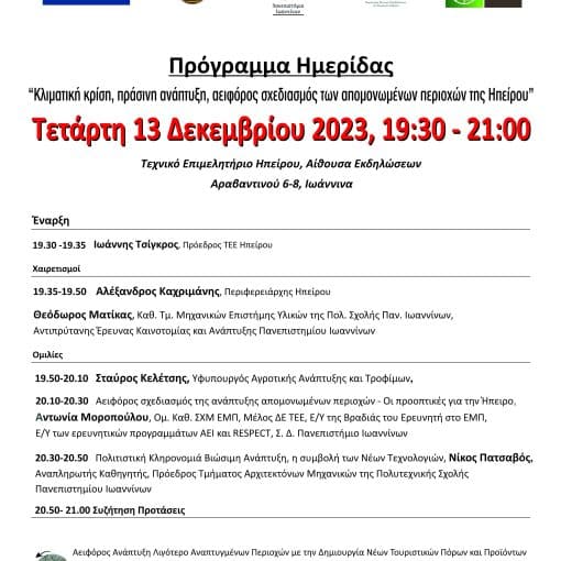 Ήπειρος Δευτέρα 11 Δεκεμβρίου 2023 - 11:30 ΤΕΕ Ηπείρου: Ημερίδα για την κλιματική κρίση, την πράσινη ανάπτυξη και τον αειφόρο σχεδιασμό των απομονωμένων περιοχών της Ηπείρου από ΟΜΑΔΑ ΣΥΝΤΑΞΗΣΤο Τμήμα Ηπείρου του ΤΕΕ υποστηρίζοντας το ρόλο του ως […]