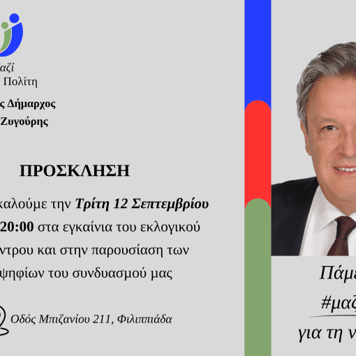 ΔΗΜΟΤΙΚΕΣ ΕΚΛΟΓΕΣ Τρίτη 5 Σεπτεμβρίου 2023 - 16:25 Δήμος Ζηρού: Το εκλογικό του κέντρο εγκαινιάζει ο Γιώργος Ζυγούρης στην Φιλιππιάδα από ΟΜΑΔΑ ΣΥΝΤΑΞΗΣΤην ερχόμενη Τρίτη 12 Σεπτεμβρίου και ώρα 20:00 θα πραγματοποιηθούν […]