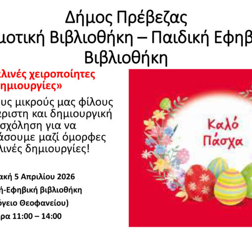 Δήμος Πρέβεζας 20 ώρες ago Πασχαλινή δημιουργική εκδήλωση για παιδιά στη Δημοτική Βιβλιοθήκη Πρέβεζας από ΟΜΑΔΑ ΣΥΝΤΑΞΗΣΣτο πλαίσιο των δράσεων του Τμήματος Πολιτισμού του Δήμου Πρέβεζας, […]