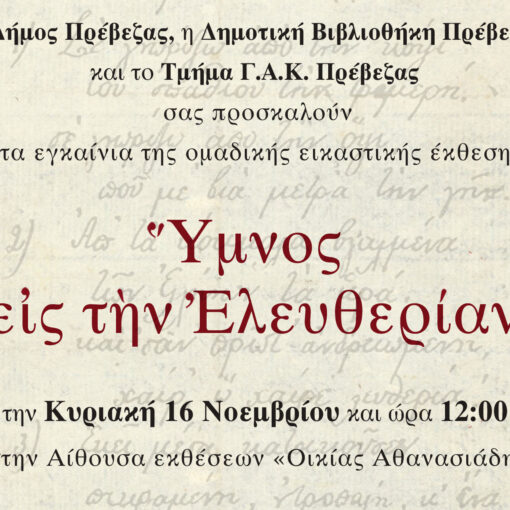 Πολιτισμός Παρασκευή 14 Νοεμβρίου 2025 - 20:14 Εγκαίνια Έκθεσης “Ύμνος εις την Ελευθερίαν” Κυριακή 16/11 από ΟΜΑΔΑ ΣΥΝΤΑΞΗΣΕγκαινιάζεται την Κυριακή 16 Νοεμβρίου 2025 στις 12:00, στην Αίθουσα […]