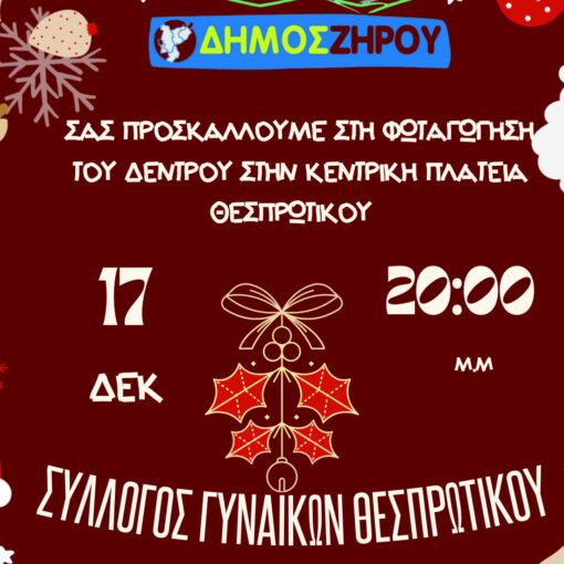 Δήμος Ζηρού Τετάρτη 10 Δεκεμβρίου 2025 - 10:54 Φωταγώγηση Χριστουγεννιάτικου Δέντρου στην Κεντρική Πλατεία Θεσπρωτικού από ΟΜΑΔΑ ΣΥΝΤΑΞΗΣΟ Δήμος Ζηρού μετά του Συλλόγου Γυναικών Θεσπρωτικού σας προσκαλούν […]