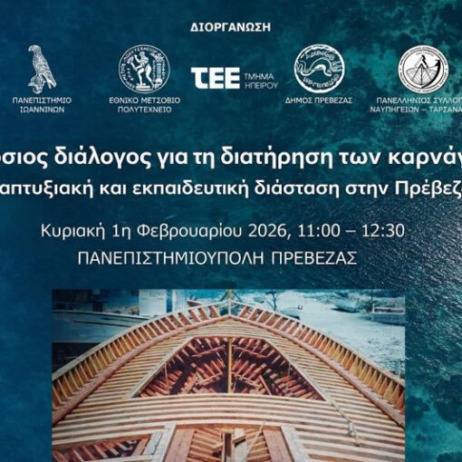 Uncategorized Τετάρτη 28 Ιανουαρίου 2026 - 13:29 Δημόσιος διάλογος για τη διατήρηση των καρνάγιων – Η αναπτυξιακή και εκπαιδευτική διάσταση στην Πρέβεζα από ΟΜΑΔΑ ΣΥΝΤΑΞΗΣΤην Κυριακή 1η Φεβρουαρίου 2026, το πρωί 1100– 1230 στην […]