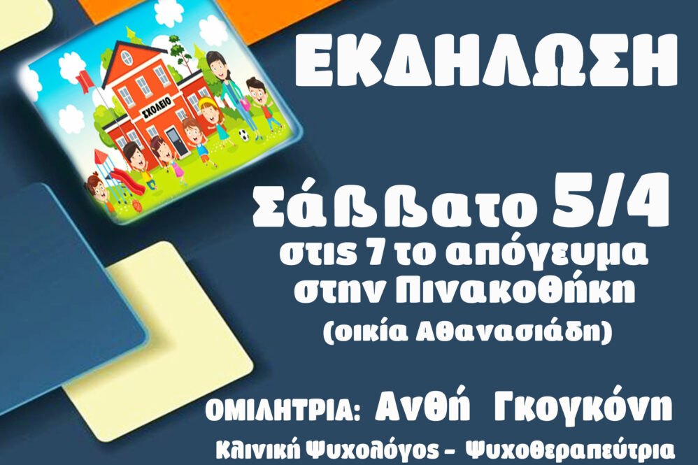 Το Δ.Σ. του Συλλόγου Εκπαιδευτικών Πρωτοβάθμιας Εκπαίδευσης Πρέβεζας διοργανώνει και καλεί εκπαιδευτικούς και γονείς το Σάββατο 5 Απριλίου στις 7 το απόγευμα στην Πινακοθήκη (οικία Αθανασιάδη) στην εκδήλωση με θέμα: