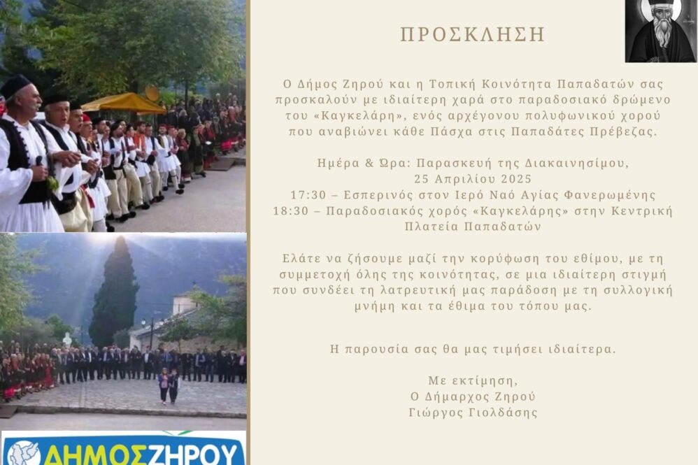 To εντυπωσιακό έθιμο του καγκελάρη του αρχέγονου πολυφωνικού χορού αναβιώνει και φέτος στις Παπαδάτες ανήμερα της Ζωοδόχου Πηγής από τον Δήμο Ζηρού και την Τ.Κ Παπαδατών.