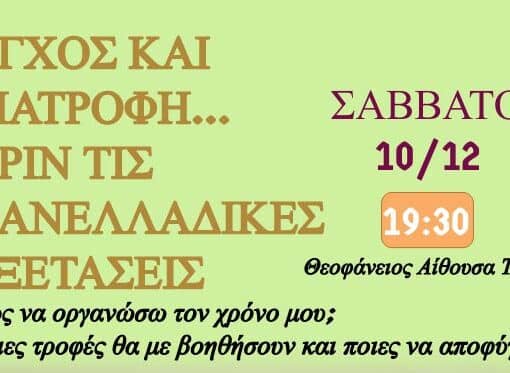 ΠΑΙΔΕΙΑ Πέμπτη 1 Δεκεμβρίου 2022 - 13:16 Εκδήλωση με θέμα: «Άγχος και διατροφή… πριν τις πανελλαδικές εξετάσεις» από ΟΜΑΔΑ ΣΥΝΤΑΞΗΣΜε μεγάλη μας χαρά και με γνώμονα τις ανάγκες των […]