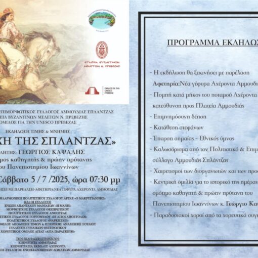 Πολιτισμός Κυριακή 6 Ιουλίου 2025 - 13:06 Εκδήλωση Τιμής και Μνήμης για τη Μάχη της Σπλάντζας στην Αμμουδιά Πρέβεζας (video-pics) από ΟΜΑΔΑ ΣΥΝΤΑΞΗΣΜε σεβασμό στην ιστορική μνήμη και με συμμετοχή πλήθους κόσμου, […]