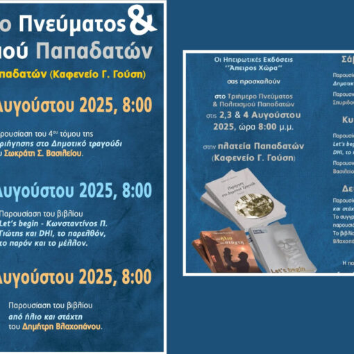 Πολιτισμός Δευτέρα 28 Ιουλίου 2025 - 18:20 Τριήμερο Πολιτισμού και Πνεύματος στους Παπαδάτες: Βραδιές αφιερωμένες στο βιβλίο και την παράδοση από ΟΜΑΔΑ ΣΥΝΤΑΞΗΣΜε ξεχωριστό ενδιαφέρον αναμένεται το Τριήμερο Πνεύματος & Πολιτισμού Παπαδάτων, […]