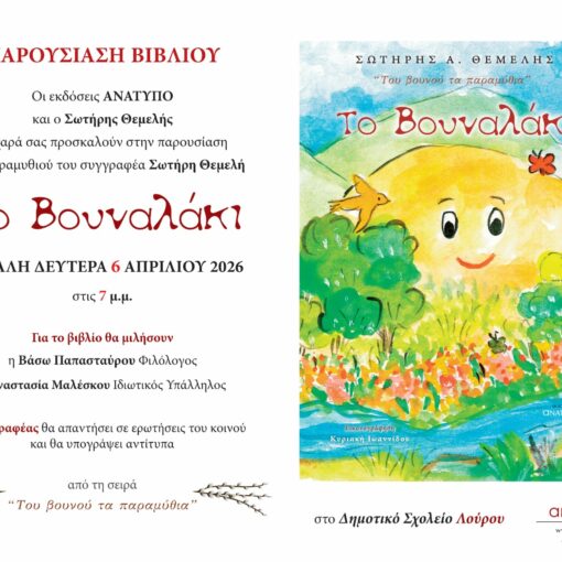 Πολιτισμός Τρίτη 31 Μαρτίου 2026 - 12:56 Παρουσίαση Βιβλίου στον Λούρο – «Του Βουνού τα Παραμύθια» ζωντανεύουν για μικρούς και μεγάλους από ΟΜΑΔΑ ΣΥΝΤΑΞΗΣΤη Μεγάλη Δευτέρα 6 Απριλίου 2026 και ώρα 19:00, στο […]