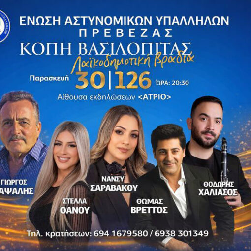 ΣΩΜΑΤΑ ΑΣΦΑΛΕΙΑΣ 12 ώρες ago Κοπή Βασιλόπιτας & Λαϊκοδημοτική Βραδιά από την Ένωση Αστυνομικών Υπαλλήλων Πρέβεζας από ΟΜΑΔΑ ΣΥΝΤΑΞΗΣΗ Ένωση Αστυνομικών Υπαλλήλων Πρέβεζας σας προσκαλεί να τιμήσετε με […]